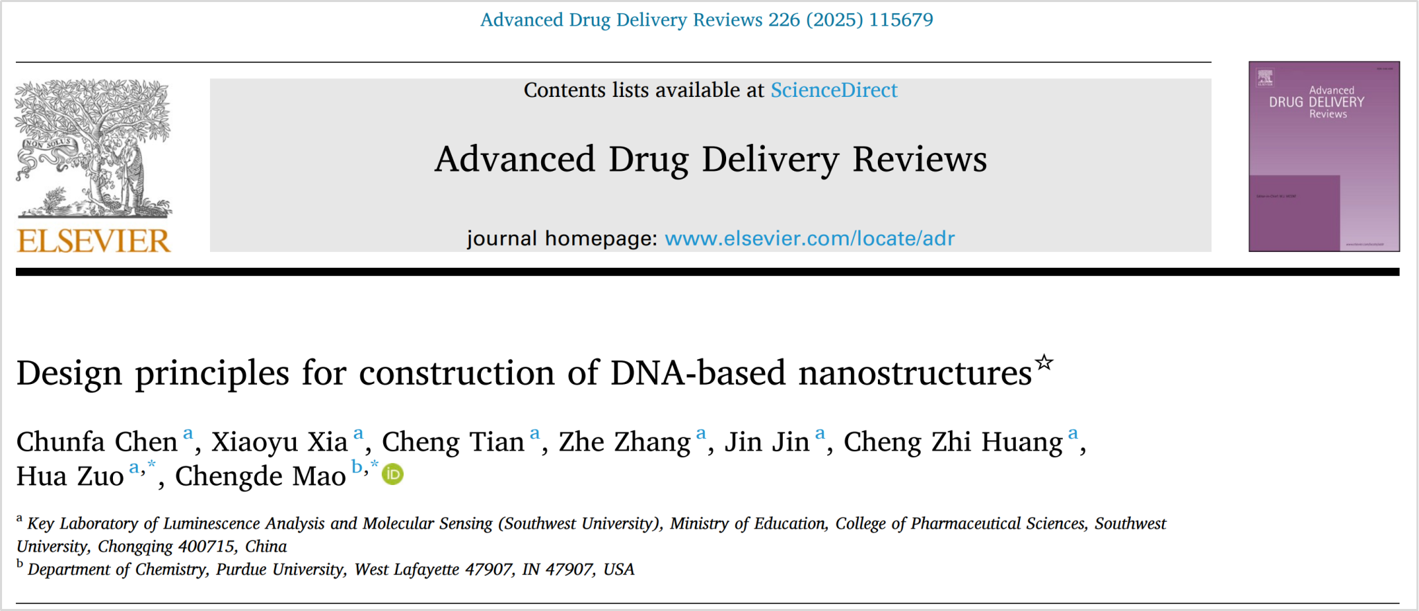 近日,重点实验室左华教授团队联合普渡大学毛诚德教授共同撰写了综述论文《Design principles for construction of DNA-based nanostructures》,正式发表于《Advanced Drug Delivery Reviews》,该论文系统梳理了构建 DNA 纳米结构的核心原理与前沿进展,为其在核酸药物开发及核酸结构相关研究中的创新应用提供了关键技术参考。