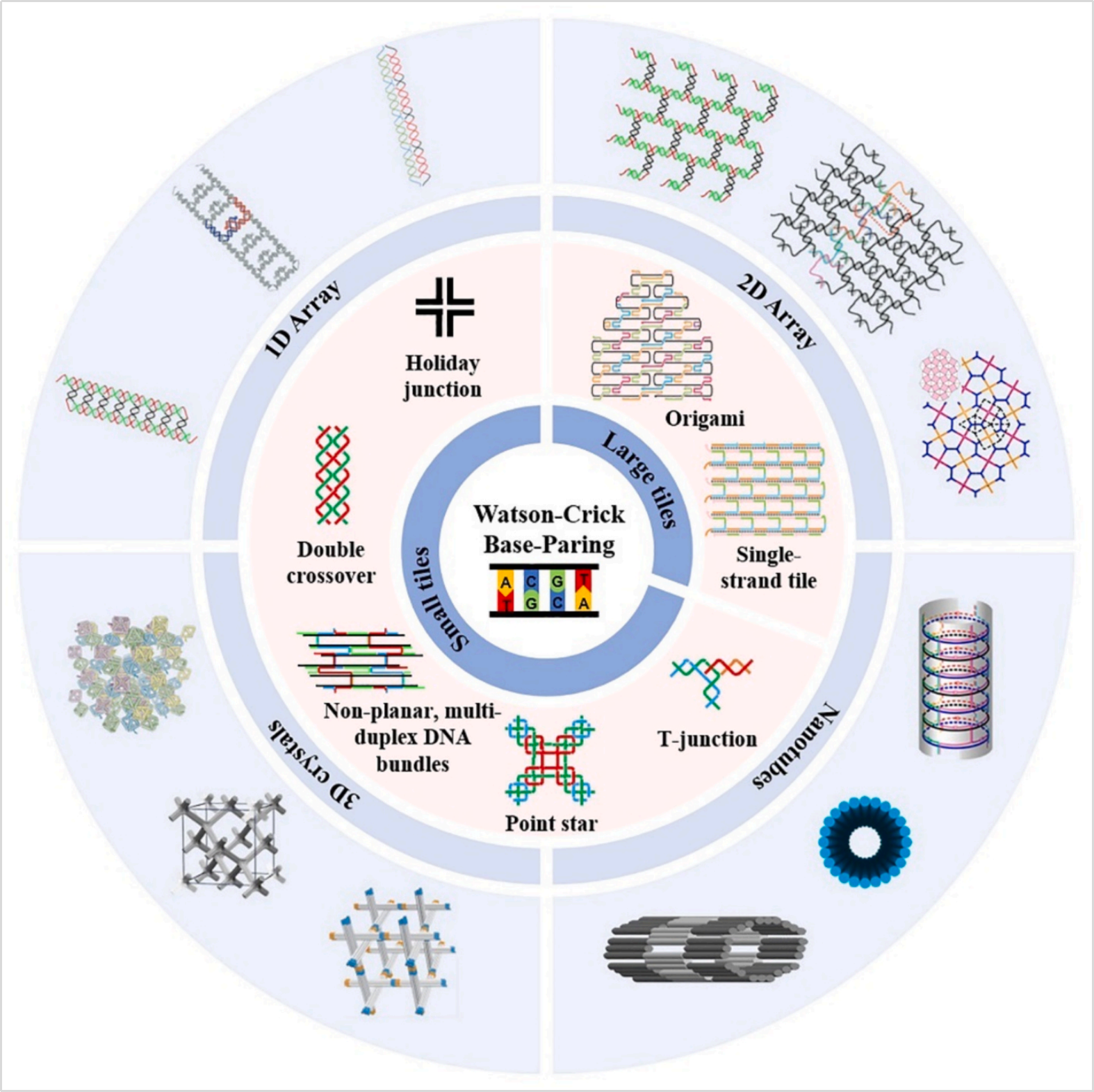 文章从基础构建单元入手,详解了小瓦片(如DX、TX瓦片、星形模块、T型结)与大瓦片(DNA折纸、单链瓦片SST)的设计逻辑,展现了从简单对称结构到复杂可寻址支架的技术演进。同时,深入探讨了1D/2D阵列、纳米管、3D晶体等扩展结构的组装机制,还介绍了算法自组装的计算潜力与DNA水凝胶、液-液相分离体系等聚集体特性。