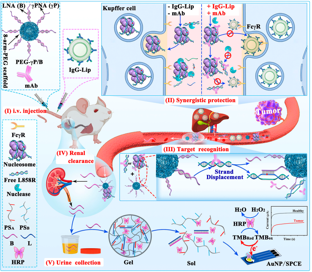 本研究提出“先饱和、后保护”的体内协同调控策略。通过注射免疫球蛋白G修饰脂质体(IgG-Lip),优先占据肝脏库普弗细胞(Kupffer cells)的Fcγ受体,暂时抑制其对ctDNA的吞噬能力,从而降低ctDNA的清除速率。在此基础上,引入抗双链DNA单克隆抗体(anti-dsDNA mAb),对循环体系中的ctDNA进行特异性结合与包裹,形成类似“保护壳”的结构,有效抵抗血液中DNase I等核酸酶的降解作用。在实现ctDNA稳定存在的基础上,构建了可在体内特异识别突变序列的核酸纳米探针体系。所设计的PEG修饰γP/B纳米探针能够在血液循环中稳定存在,并针对EGFR L858R等典型突变位点,通过立足点介导的链置换反应(toehold-mediated strand displacement reaction, TSDR)实现高特异性识别。一旦识别目标ctDNA,探针释放出尺寸较小的报告链(Probe B),实现分子层面的信号转化。进一步地,本研究将体内识别事件与体外信号检测进行巧妙耦合。释放的Probe B由于尺寸小于肾小球滤过阈值(<6 nm),可随血液循环进入肾脏并经尿液排出,实现从“血液信号”向“尿液信号”的转导。基于此,在尿液中构建DNA水凝胶放大体系,利用Probe B触发水凝胶结构解离并释放辣根过氧化物酶(HRP),通过酶催化反应产生显著增强的电化学信号,从而实现对ctDNA的高灵敏检测。