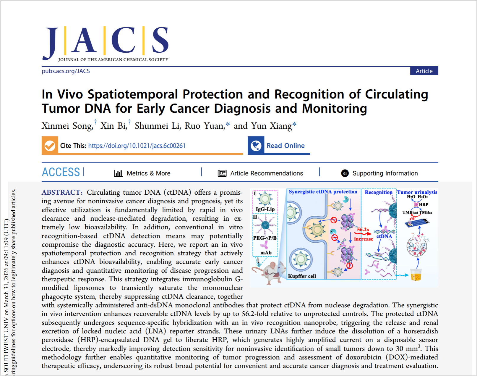 近日,重点实验室袁若/向云团队在《Journal of the American Chemical Society》上在线发表了题为“In Vivo Spatiotemporal Protection and Recognition of Circulating Tumor DNA for Early Cancer Diagnosis and Monitoring”的研究论文。提出了一种全新的“体内时空保护与识别”策略,研究者们没有在体外苦苦追寻微量ctDNA,而是直接在活体内为ctDNA派去了“贴身保镖”和“识别探针”,将可检测到的ctDNA水平提升了56.2倍,并能通过尿液实现早期肿瘤的精准监测。