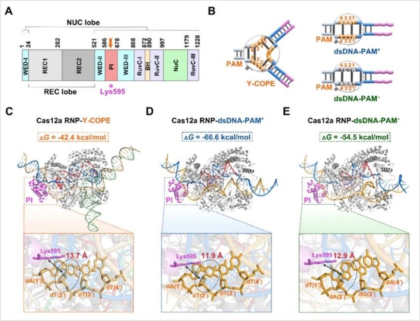 通过结构建模和理论结合能分析计算发现,Y-COPE与Cas12a RNP的结合自由能比经典dsDNA激活子高24.2 kcal/mol,且PAM与Cas12a蛋白PI结构域中关键残基Lys595之间的中心距离增加了1.8 Å,从机制上揭示了PAM拓扑结构抑制Cas12a活性的作用机制。
