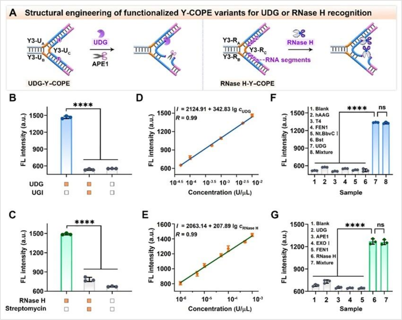 最后,作为概念验证,该团队成功构建了用于尿嘧啶DNA糖基化酶(UDG)和核糖核酸酶H(RNase H)检测的功能化Y-COPE变体。UDG检测限达2.69×10–5 U/μL,RNase H检测限低至2.55×10–7U/μL,且在复杂生物基质中检测性能优良,显示出高的特异性和抗干扰能力。
