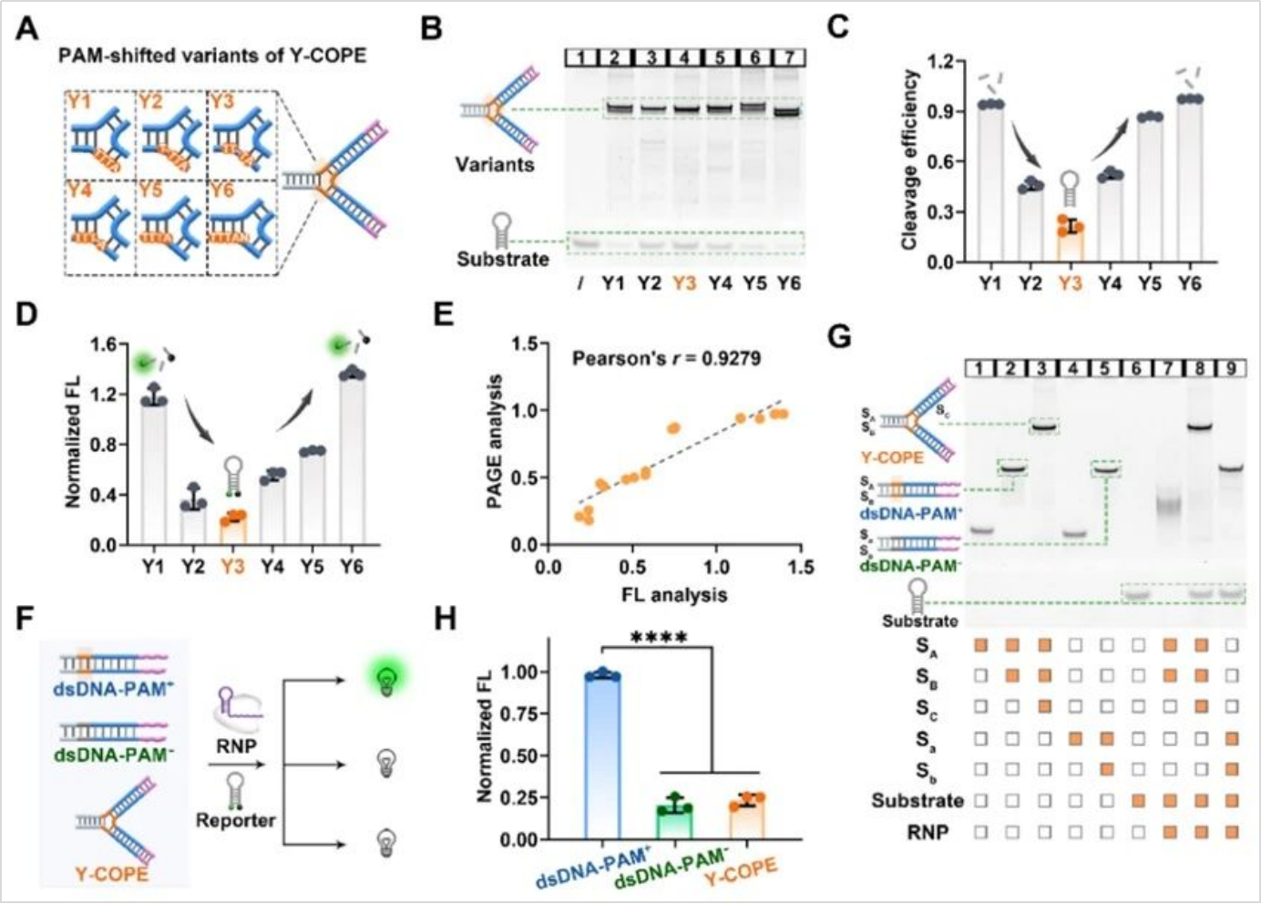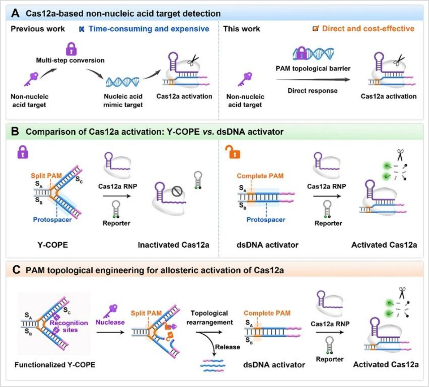 具体而言,该研究团队通过将PAM序列分裂并嵌入三叉连接中心,设计了一种含有Cas12a激活子序列的Y形DNA结构(Y-COPE)。这种精心设计的拓扑结构有效阻断Cas12a对PAM的识别,从而抑制其活性。当目标核酸酶识别切割特定位点后,释放DNA片段并动态修复PAM的双链结构,从而激活Cas12a并触发信号输出。